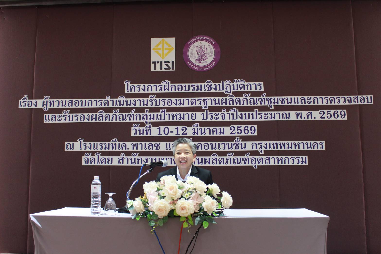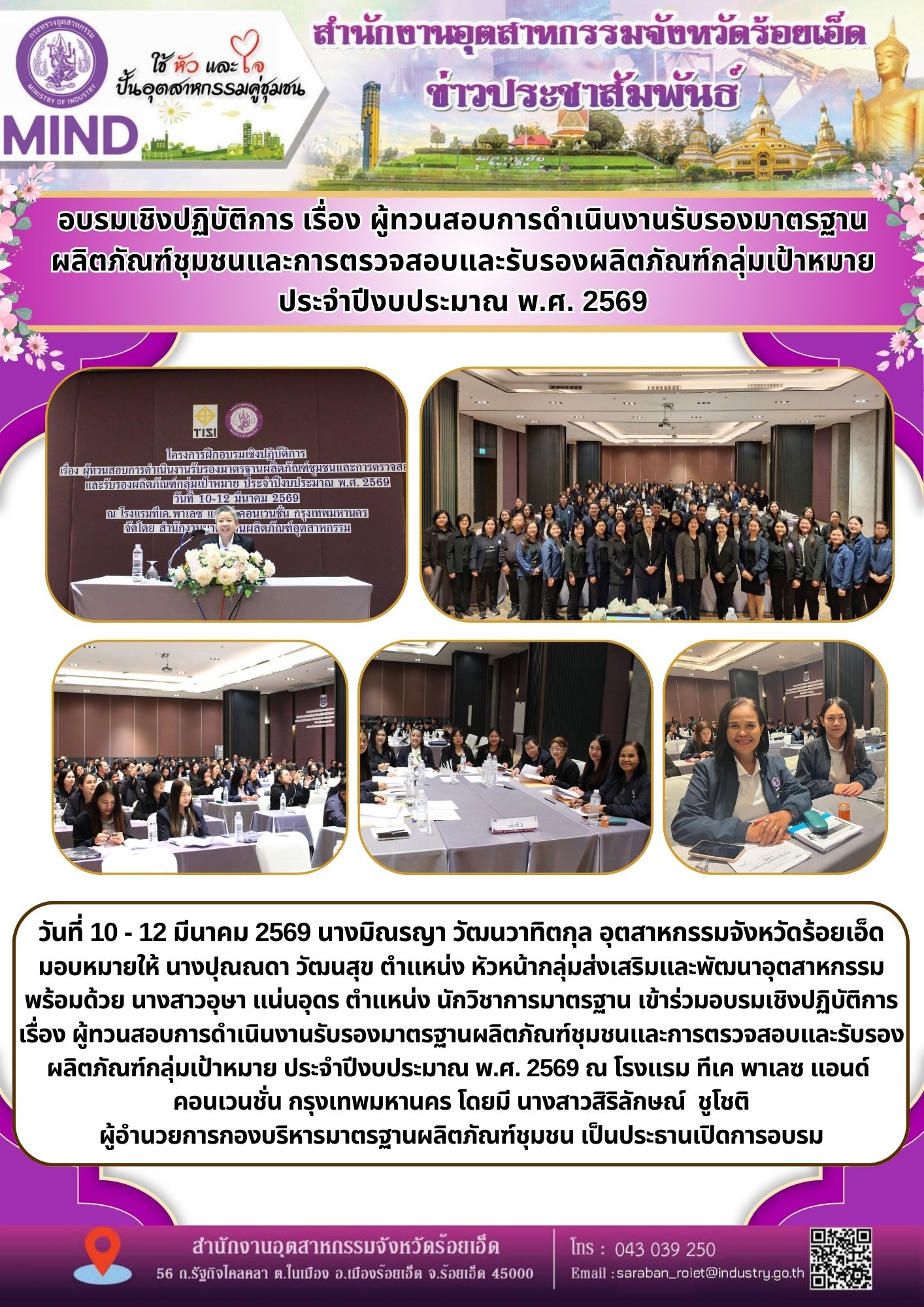 วันที่ 10 - 12 มีนาคม 2569 นางมิณรญา วัฒนวาทิตกุล อุตสาหกรรมจังหวัดร้อยเอ็ด มอบหมายให้ นางปุณณดา วัฒนสุข ตำแหน่ง หัวหน้ากลุ่มส่งเสริมและพัฒนาอุตสาหกรรม พร้อมด้วย นางสาวอุษา แน่นอุดร ตำแหน่ง นักวิชาการมาตรฐาน เข้าร่วมอบรมเชิงปฏิบัติการ เรื่อง ผู้ทวนสอบการดำเนินงานรับรองมาตรฐานผลิตภัณฑ์ชุมชนและการตรวจสอบและรับรองผลิตภัณฑ์กลุ่มเป้าหมาย ประจำปีงบประมาณ พ.ศ. 2569 ณ โรงแรม ทีเค พาเลซ แอนด์ คอนเวนชั่น กรุงเทพมหานคร โดยมี นางสาวสิริลักษณ์ ชูโชติ ผู้อำนวยการกองบริหารมาตรฐานผลิตภัณฑ์ชุมชน เป็นประธานเปิดการอบรม