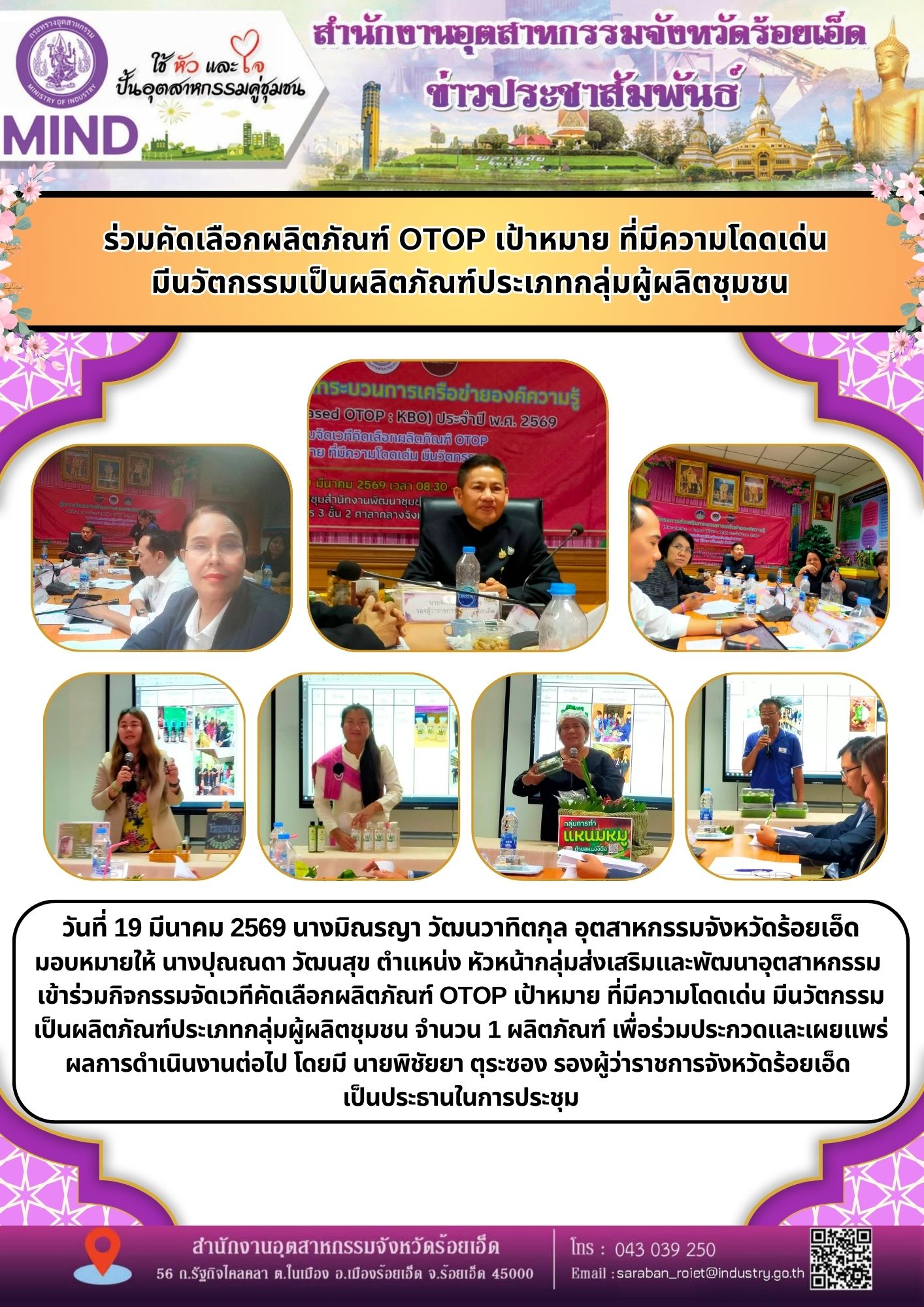 วันที่ 19 มีนาคม 2569 นางมิณรญา วัฒนวาทิตกุล อุตสาหกรรมจังหวัดร้อยเอ็ด มอบหมายให้ นางปุณณดา วัฒนสุข ตำแหน่ง หัวหน้ากลุ่มส่งเสริมและพัฒนาอุตสาหกรรม เข้าร่วมกิจกรรมจัดเวทีคัดเลือกผลิตภัณฑ์ OTOP เป้าหมาย ที่มีความโดดเด่น มีนวัตกรรมเป็นผลิตภัณฑ์ประเภทกลุ่มผู้ผลิตชุมชน จำนวน 1 ผลิตภัณฑ์ เพื่อร่วมประกวดและเผยแพร่ผลการดำเนินงานต่อไป โดยมี นายพิชัยยา ตุระซอง รองผู้ว่าราชการจังหวัดร้อยเอ็ด เป็นประธานในการประชุม