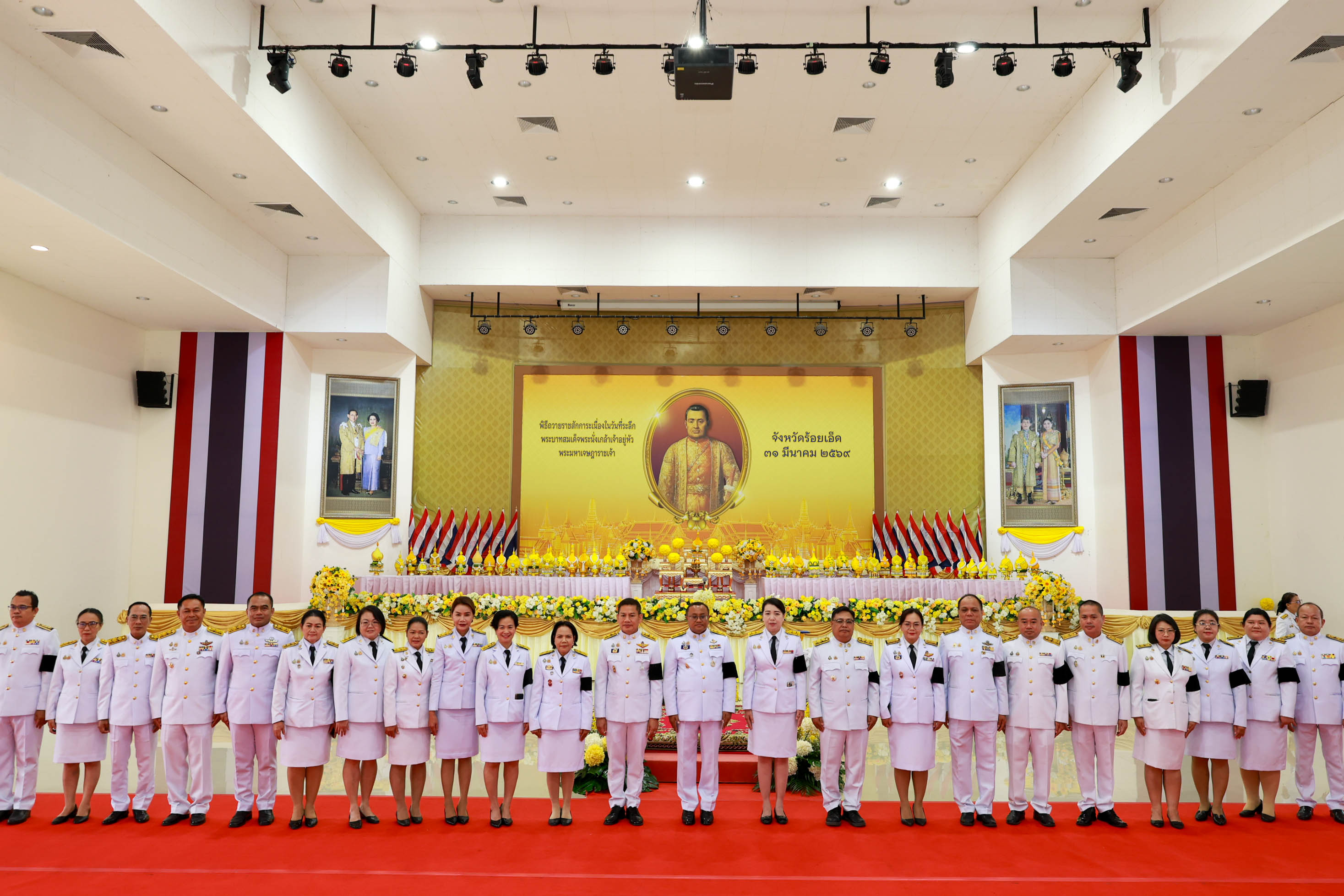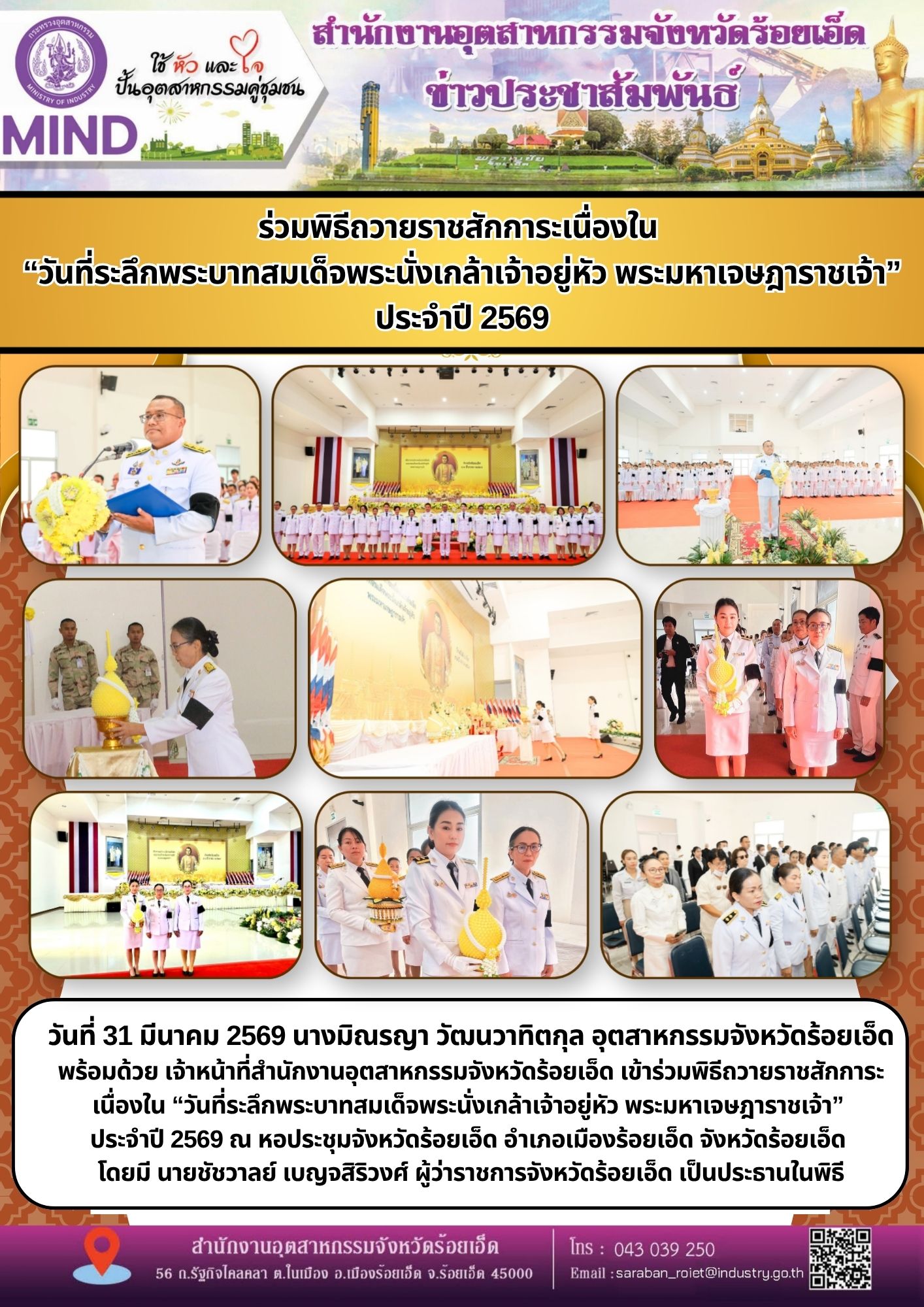 วันที่ 31 มีนาคม 2569 นางมิณรญา วัฒนวาทิตกุล อุตสาหกรรมจังหวัดร้อยเอ็ด พร้อมด้วย เจ้าหน้าที่สำนักงานอุตสาหกรรมจังหวัดร้อยเอ็ด เข้าร่วมพิธีถวายราชสักการะเนื่องใน “วันที่ระลึกพระบาทสมเด็จพระนั่งเกล้าเจ้าอยู่หัว พระมหาเจษฎาราชเจ้า” ประจำปี 2569 ณ หอประชุมจังหวัดร้อยเอ็ด อำเภอเมืองร้อยเอ็ด จังหวัดร้อยเอ็ด โดยมี นายชัชวาลย์ เบญจสิริวงศ์ ผู้ว่าราชการจังหวัดร้อยเอ็ด เป็นประธานในพิธี