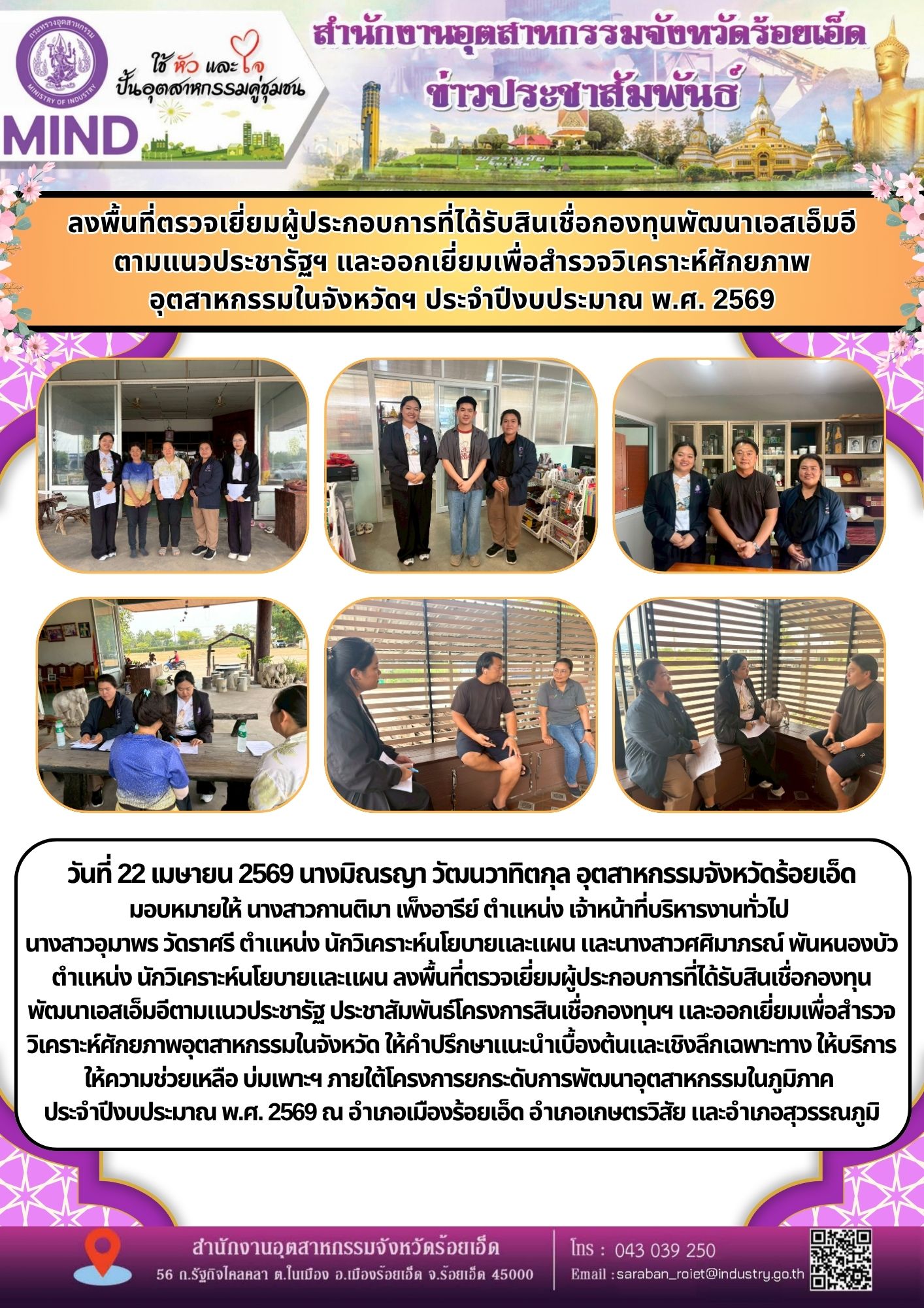 วันที่ 22 เมษายน 2569 นางมิณรญา วัฒนวาทิตกุล อุตสาหกรรมจังหวัดร้อยเอ็ด มอบหมายให้ นางสาวกานติมา เพ็งอารีย์ ตำแหน่ง เจ้าหน้าที่บริหารงานทั่วไx นางสาวอุมาพร วัดราศรี ตำแหน่ง นักวิเคราะห์นโยบายและแผน และนางสาวศศิมาภรณ์ พันหนองบัว ตำแหน่ง นักวิเคราะห์นโยบายและแผน ลงพื้นที่ตรวจเยี่ยมผู้ประกอบการที่ได้รับสินเชื่อกองทุนพัฒนาเอสเอ็มอีตามแนวประชารัฐ ประชาสัมพันธ์โครงการสินเชื่อกองทุนฯ และออกเยี่ยมเพื่อสำรวจวิเคราะห์ศักยภาพอุตสาหกรรมในจังหวัด ให้คำปรึกษาแนะนำเบื้องต้นและเชิงลึกเฉพาะทาง ให้บริการให้ความช่วยเหลือ บ่มเพาะฯ ภายใต้โครงการยกระดับการพัฒนาอุตสาหกรรมในภูมิภาค ประจำปีงบประมาณ พ.ศ. 2569 ณ อำเภอเมืองร้อยเอ็ด อำเภอเกษตรวิสัย และอำเภอสุวรรณภูมิ
