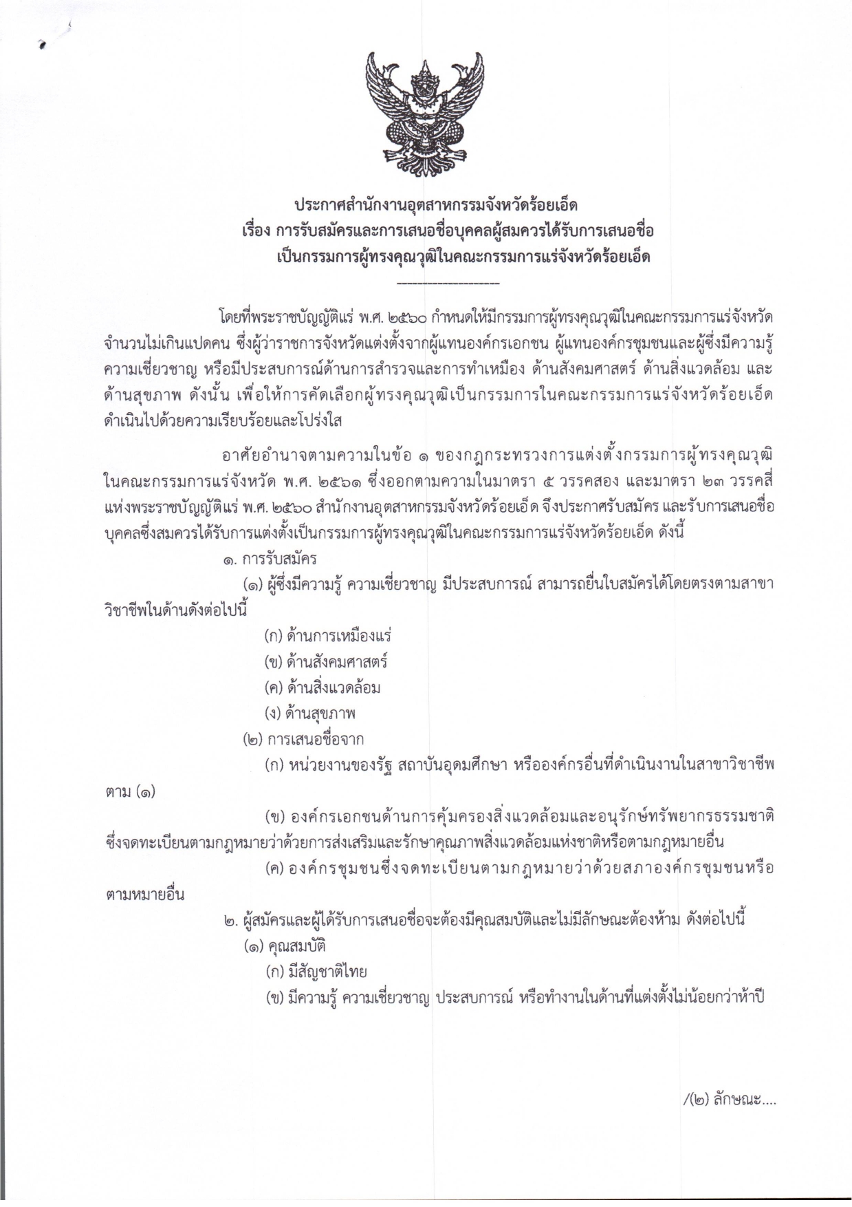 ิประกาศสำนักงานอุตสาหกรรมจังหวัดร้อยเอ็ด เรื่อง การรีบสม้ครและการเสนอชื่อบุคคลผู้สมควรได้รับการเสนอชื่อเป็นกรรมการผู้ทรงคุณวุฒิในคณะกรรมการแร่จังหวัด
